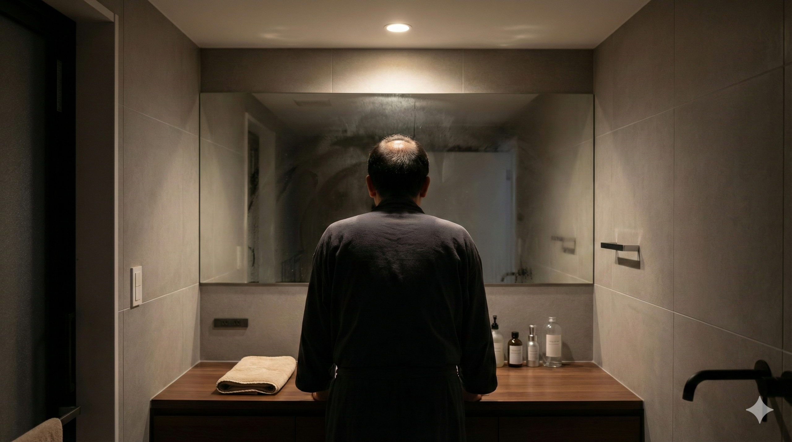 頭頂部は自分の目で見えにくいぶん、スマホで撮った写真や、強い照明の下で急に不安になりやすい場所です。しかも頭頂部は、光・濡れ髪・整髪料・乾かし方・分け癖で“薄く見えるだけ”が起こりやすく、自己判断がブレがち。