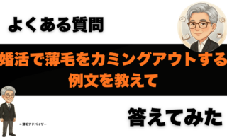 よくある疑問婚活 薄毛 カミングアウト 例文まとめ:重くならないタイミング別テンプレと、反応が怖いときの切り返し 婚活で薄毛をカミングアウトしたいけど言葉が出ない人へ。重くならない伝え方は「事実→気持ち→これから」を短く。初対面〜交際前後のタイミング別例文、NG表現、相手の反応別の切り返しまでテンプレ化。薄毛の不安が強い場合の受診目安も解説。よくある疑問記事一覧